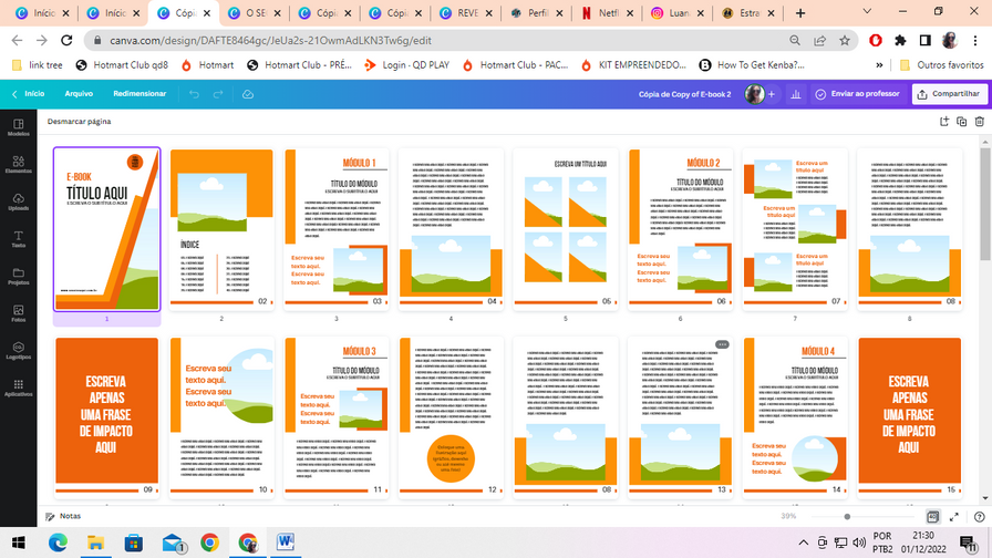 Você não vai precisar quebrar a cabeça pra criar o designer e diagramar o seu e-book, é só editar os templates no Canva como desejar.